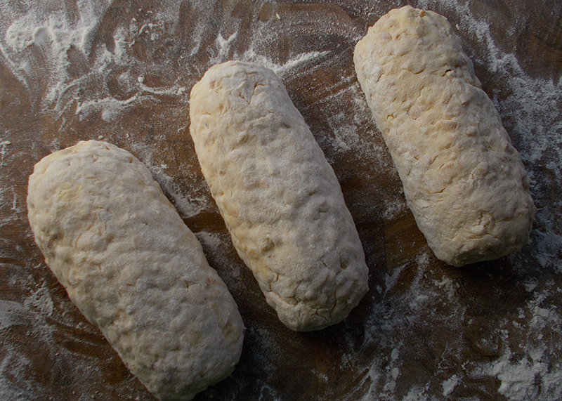 Die Masse auf eine bemehlte Fläche geben und zu Striezeln formen (nicht zu locker, aber nicht kneten!)