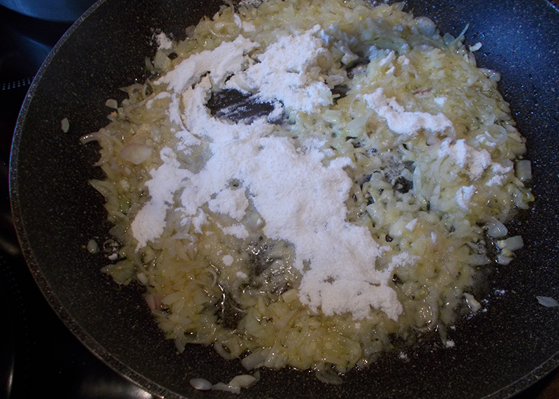 Zwiebel und Knoblauch in Pfanne anschwitzen, mehlieren. Normalerweise werden hier die Speckwürfel gleich mitgebraten.