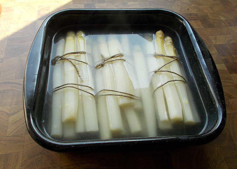Serviert man den Spargel nicht gleich, lässt er sich in einem Geschirr mit kaltem Wasser, dem man etwas vom Spargelsud (Kochwasser) beigibt, gut aufbewahren, auch über Nacht. Vor dem Servieren einfach im Spargelsud – oder am nächsten Tag in frischem Wasser – aufwärmen.