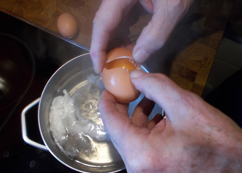 Einen Topf Wasser mit Salz und einem guten Schuss Essig zum Kochen bringen, dann ein Ei aufschlagen, direkt ins das kochende Wasser.