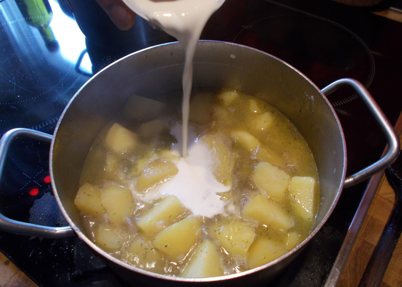 Zugedeckt kochen lassen, bis die Kartoffeln bissfest sind, eventuell Flüssigkeit nachgießen. Würzen mit Dille, Salz, Pfeffer, Muskat und einem Schuss Weißwein. Mit Obers verfeinern und noch etwas köcheln lassen. Fertig!