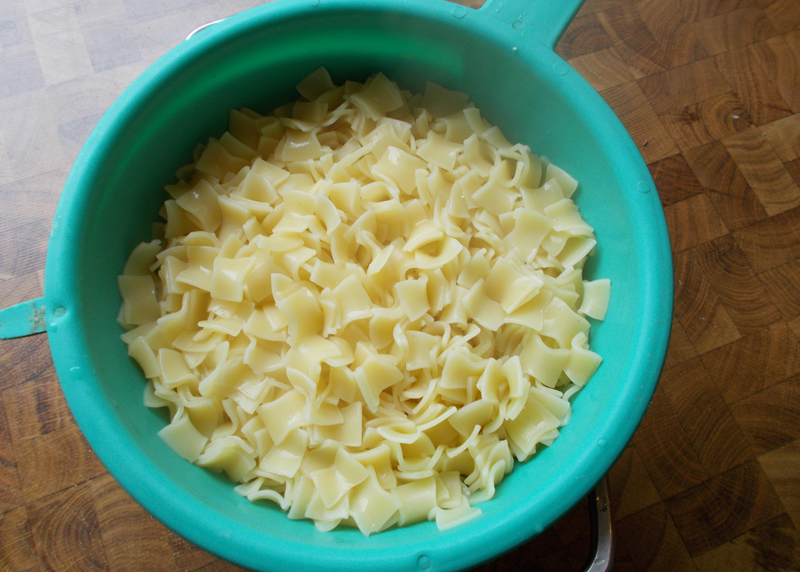 Fleckerl in Salzwasser bissfest kochen, abseihen und zum Kraut geben, wieder gut durchmischen und würzen: gehackter Kümmel, Pfeffer, etwas Muskat und Salz (beim Salz vorsichtig sein, da der Speck ja ohnehin schon salzig ist).