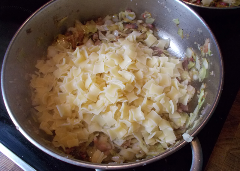 TIpp: Für die ungarische Variante die Kraut-Speck-Mischung „paprizieren“ (etwas Paprikapulver untermischen, bevor man die Fleckerl dazugibt)