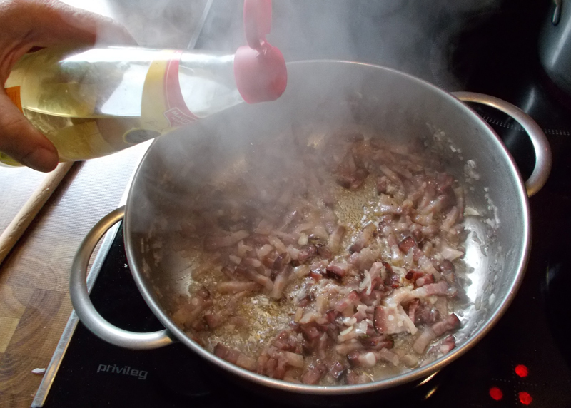 Zwiebel und Knoblauch mit ein wenig Zucker glasig anschwitzen (der Zucker ist das „Gegengewicht“ zum Essig), Speck mitrösten. Wenn alles gut durchgeröstet ist, mit einem Spritzer Essig ablöschen. Dann das geschnittene Kraut beigeben und gut vermischen. Das Kraut lässt Wasser, also ist keine zusätzliche Flüssigkeit nötig. Deckel drauf, und bei mittlerer Hitze dünsten lassen, ab und zu umrühren, bis das Kraut weich ist. Das geht relativ flott.