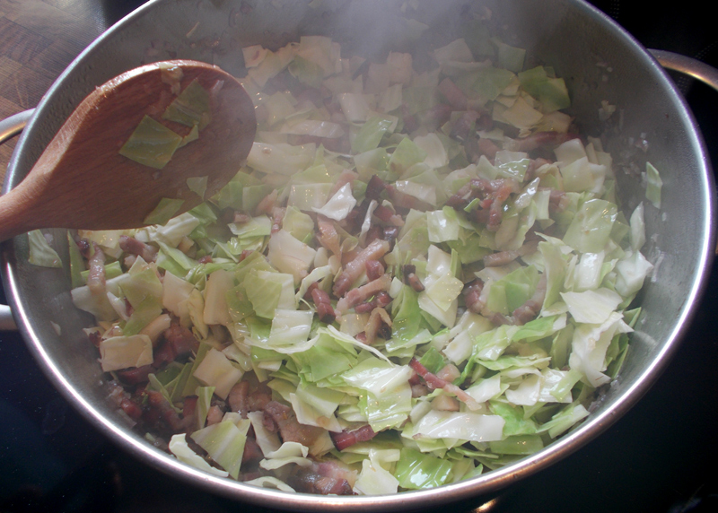 Dann das geschnittene Kraut beigeben und gut vermischen. Das Kraut lässt Wasser, also ist keine zusätzliche Flüssigkeit nötig. Deckel drauf und bei mittlerer Hitze dünsten lassen, ab und zu umrühren, bis das Kraut weich ist.