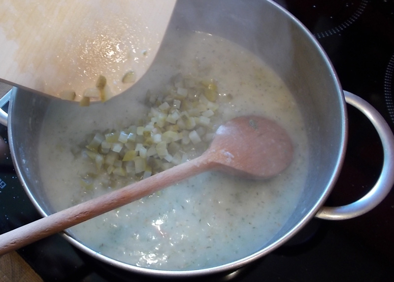 Für die dunklere Einbrenn Zwiebel und Knoblauch gut anrösten, mit Mehl stauben und durchrühren, bis alles eine gute Farbe angenommen hat (- der Profi streut auch gern eine Prise Zucker über die Zwiebel). Mit Bouillon (oder Suppenwürfel) aufgießen, gut durchrühren, bis die Einbrenn fertig ist, also eine gute, leicht dickflüssige Konsistenz hat. Gurkerl und Gewürz (Marjoran und Kümmel), einen Spritzer Essig und den Obers einrühren, die gekochten Erdäpfeln dazugeben, und mit Salz und Pfeffer abschmecken