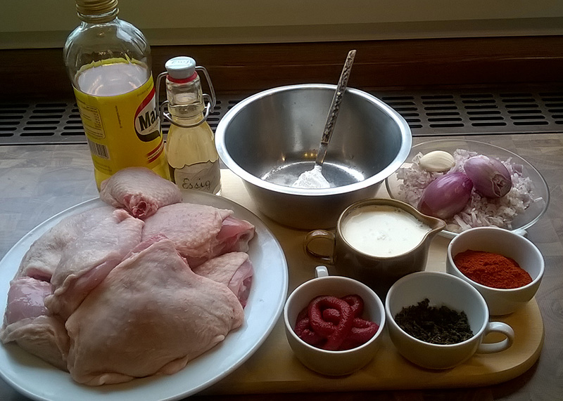 Zutaten: Hühnerbrust oder -keulen, Zwiebel, Paprikapulver (edelsüß), Butterschmalz oder Öl, Tomatenmark, Essig, Gulaschgewürz, Obers, Mehl, Salz, Pfeffer