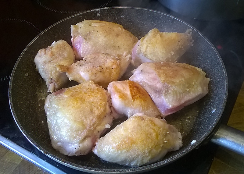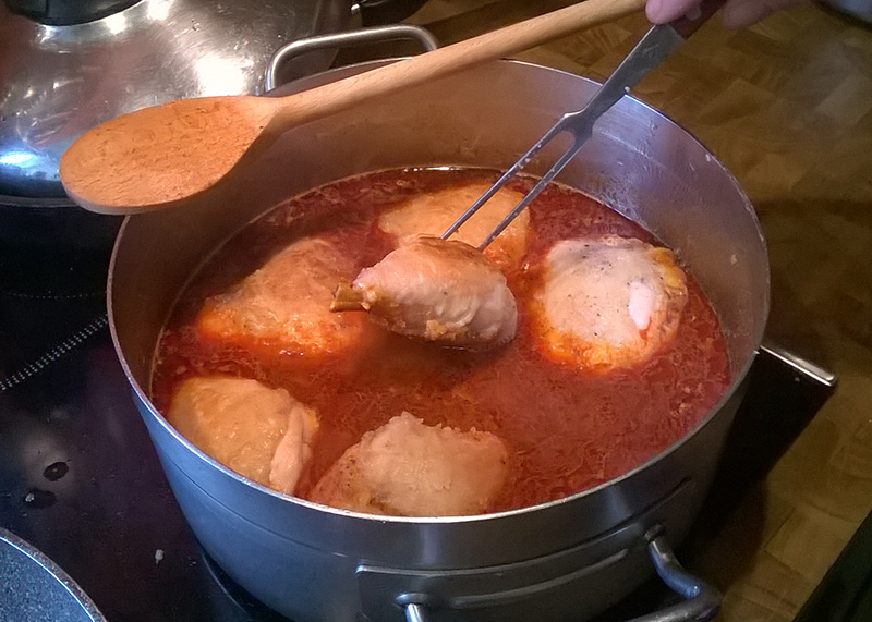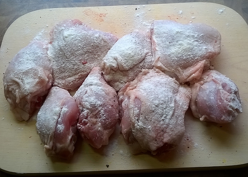 In einer Pfanne Öl erhitzen, die mit Salz und Pfeffer gewürzten Hühnerteile leicht mehlieren („stauben“) und im heißen Öl beidseitig kurz anbraten. Die angebratenen Hühnerteile in die vorbereitete Paprikasauce einlegen und zugedeckt 15 Minuten köcheln lassen.