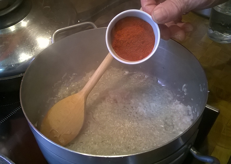 … einen gehäuften Teelöffel Gulaschgewürz dazugeben und leicht köcheln lassen.