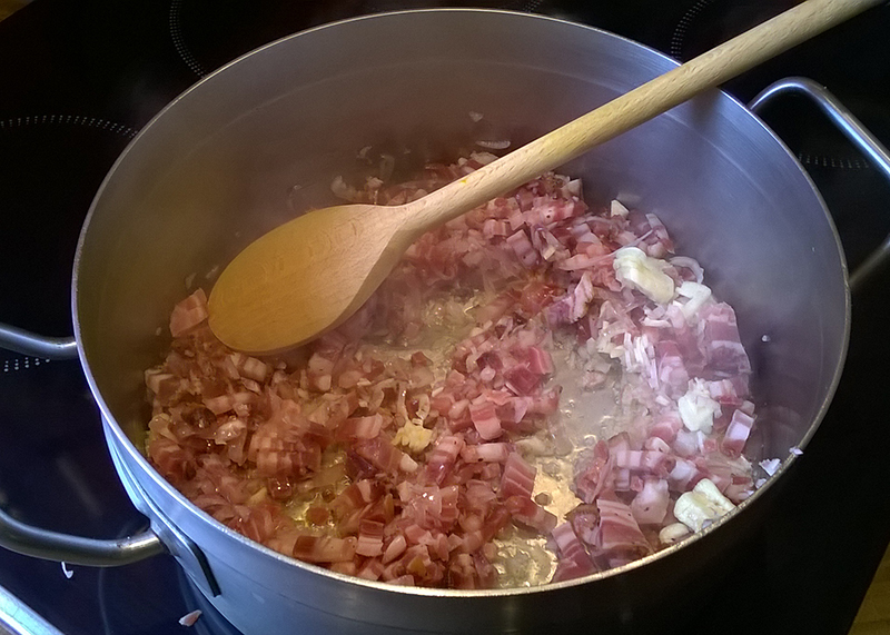 Kleingeschnittenen Zwiebel und blättrig geschnittenen Knoblauch in Butterschmalz anrösten, den würfelig geschnittenen Speck dazugeben und kurz mitrösten.