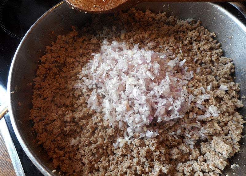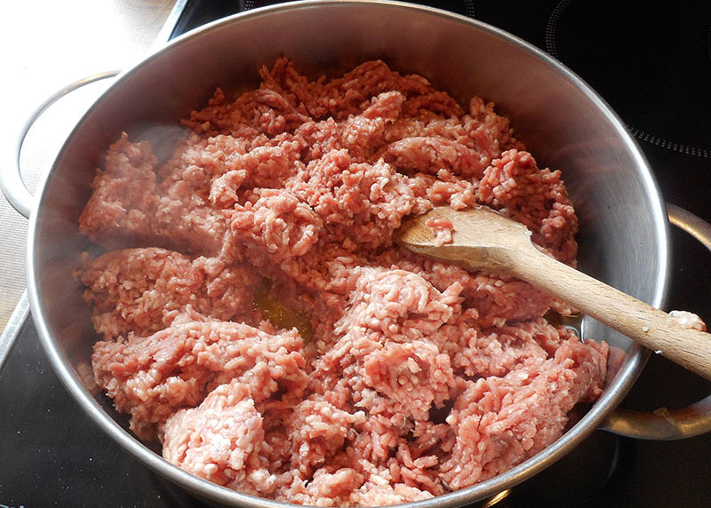 Zutaten: Gemischtes Faschiertes, Olivenöl, Tomatenmark, gewürfelte Tomaten (Dose), Zwiebel, Salz, Pfeffer, Würzmischung (Speck, Knoblauch, Petersilie), Thymian, Oregano, Rosmarin, event. Bouillon