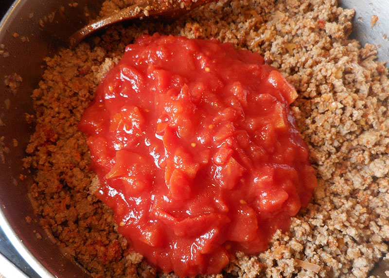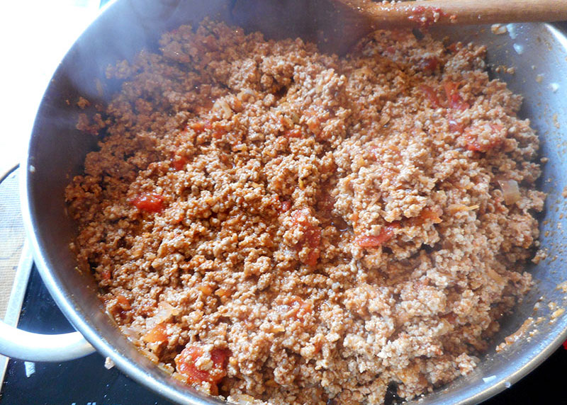 Zutaten: Gemischtes Faschiertes, Olivenöl, Tomatenmark, gewürfelte Tomaten (Dose), Zwiebel, Salz, Pfeffer, Würzmischung (Speck, Knoblauch, Petersilie), Thymian, Oregano, Rosmarin, event. Bouillon zum Aufgießen