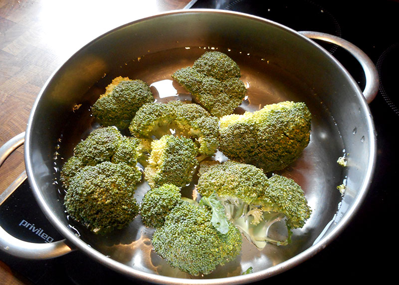 Brokkoli vierteln, in Salzwasser kurz kochen, in kaltem Wasser abschrecken und auf ein Blech oder in eine ofenfeste Form legen.