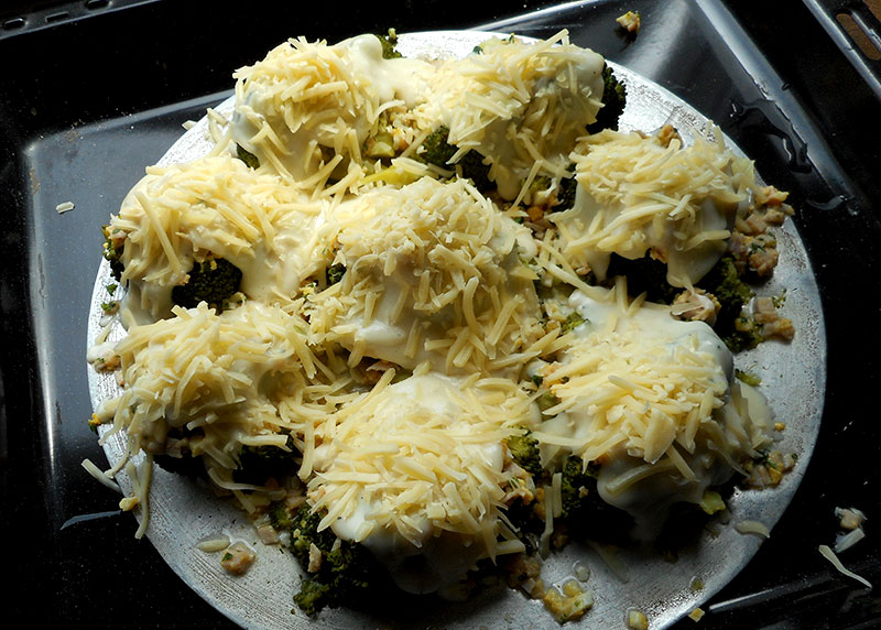 Zutaten: Brokkoli, Käse (zB Emmentaler), hartgekochte Eier, Schinken (geht auch ohne – oder mit Räuchertofu statt Schinken), Petersilie, Sauce Béchamel