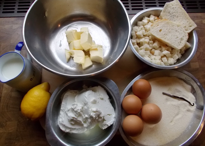 Zutaten für 6 Personen als Hauptspeise: 15 dag Butter, 500 g Topfen (Magertopfen), 5 Eier, 25 dag Grieß, 5 Semmeln (abgerindet), Vanilleschote (oder 1 Pkg. Vanillezucker), Zitronenabrieb, etwas Milch, Prise Salz. Für die Bröselmischung: Semmelbrösel, Butter, Zucker (event. Zimt)