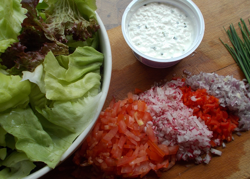 Zutaten: verschiedene Blattsalate, Tomaten, Paprika, Charlotten, Radieschen, Kartoffeln, Hüttenkäse (Cottagecheese), Schnittlauch