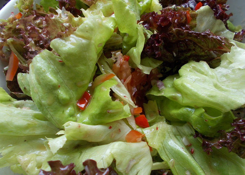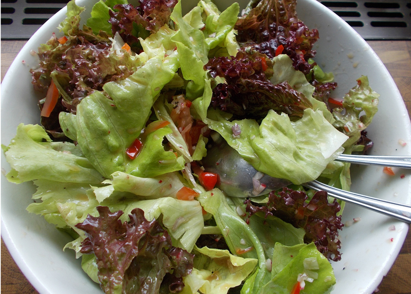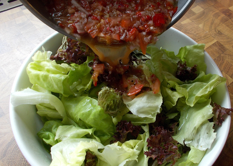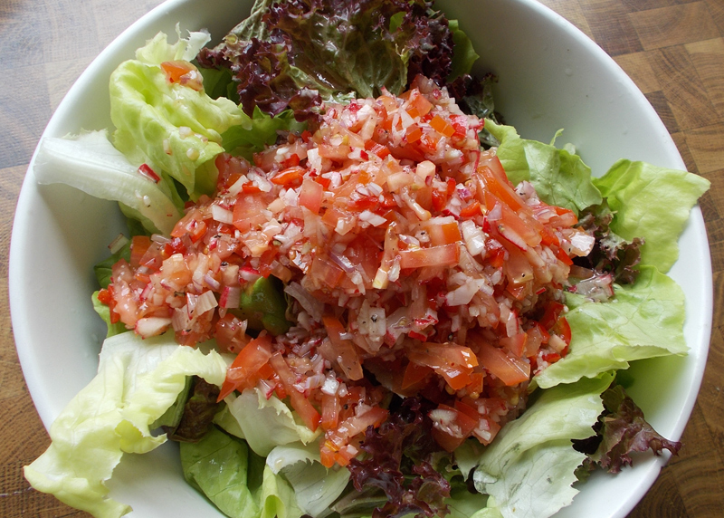 Zutaten: verschiedene Blattsalate, Tomaten, Paprika, Charlotten, Radieschen, Kartoffeln, Hüttenkäse (Cottagecheese), Schnittlauch. Für die Marinade: süßer Senf, Balsamicoessig, Öl (kein Olivenöl), Salz, eine Prise Zucker, Zitronensaft, einen Spritzer Worcestersauce, Pfeffer.
