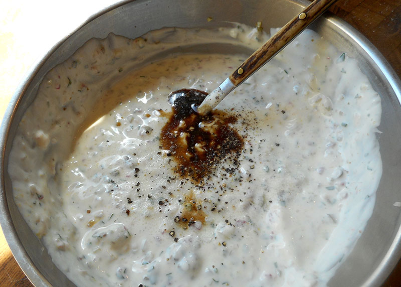 Zutaten: Joghurt (am besten 3,5 % Fett), Radieschen, Essiggurkerl, Schalotten oder Zwiebel, Kapern, Sardellen, Petersilie, Senf, etwas Salz und Pfeffer, eventuell Worcestersauce