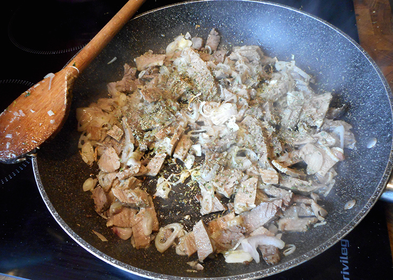 Zwiebel und Knoblauch anrösten, Rindfleisch dazugeben, gemeinsam durchrösten lassen. Würzen mit Majoran, Pfeffer und Salz, gehackte Petersilie untermischen. Dann dürfen auch die Kartoffeln in die Pfanne – langsam mitrösten.