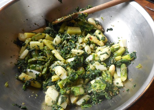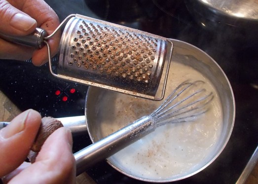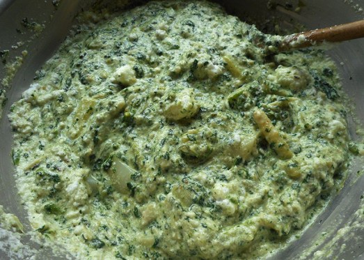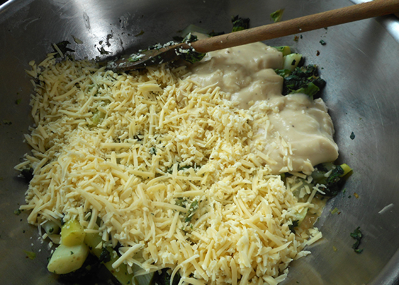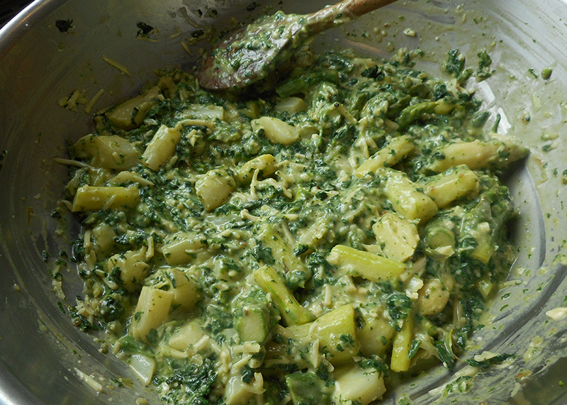 … und mit der Spinat-Spargel-Masse verrühren, danach die ausgekühlte Sauce Béchamel und geriebenen Käse beigeben.