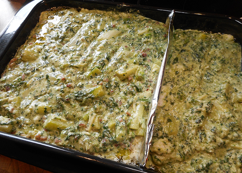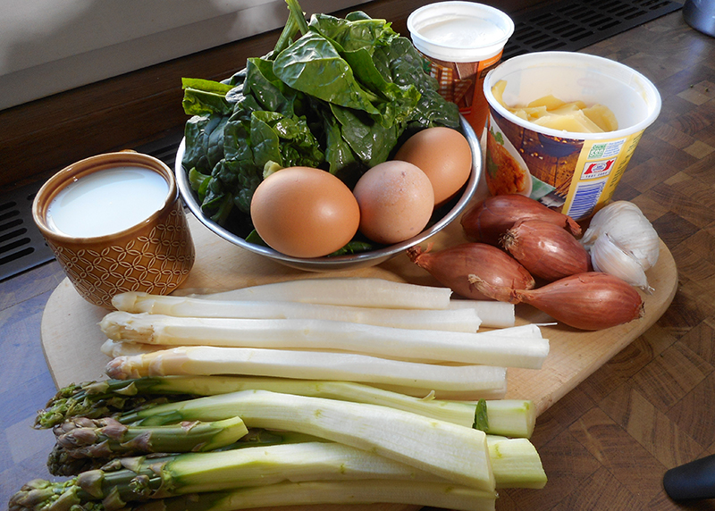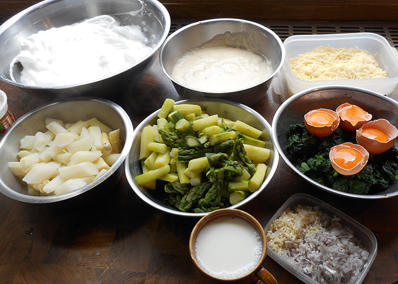 Zutaten: Je ein Bund weißer und grüner Spargel, 1/2 kg frischen Blattspinat, Zwiebel, Butterschmalz oder Öl, Reibkäse (zB Emmentaler), 4 Eier, Salz, Pfeffer, Muskat, Knoblauch, Obers, etwas Zitronensaft – und selbst gemachte Sauce Béchamel.