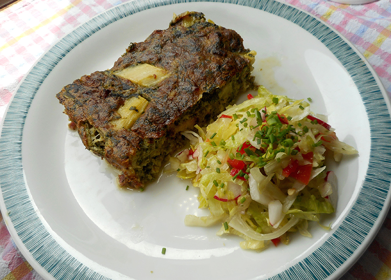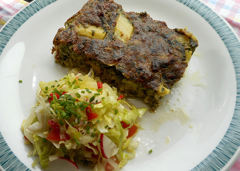 Der Spargel-Spinat-Auflauf ist servierfertig! Und so saftig, dass ein Salat als Beilage völlig reicht.
