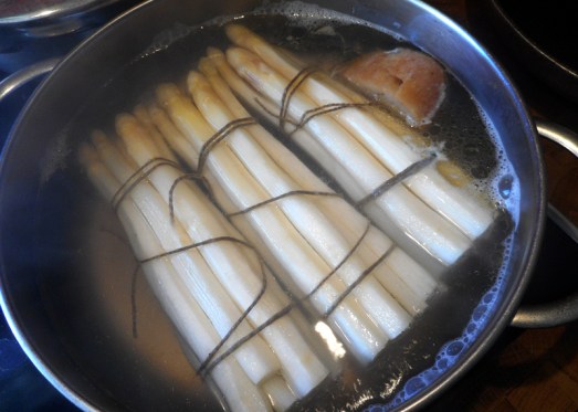 Den Spargel schälen (siehe Video) und nach Grundrezept zubereiten. 10 Minuten leicht kochen lassen, dann ein Glas kaltes Wasser beigeben und den Topf vom Herd nehmen. Ziehen lassen.