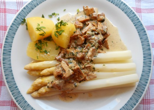 Spargel auf den Teller heben, Rahm-Eierschwammerl und ein paar frischgekochte Kartofferl dazu: Mahlzeit.
