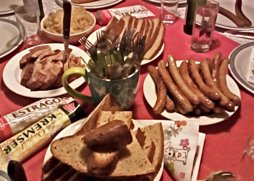 Unser Weihnachtstisch 2017, mit Tofu-Bratwürstl (im rechten oberen Eck) und Osterhasen-Servietten.