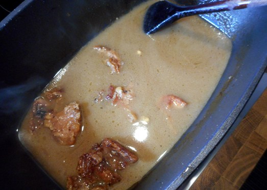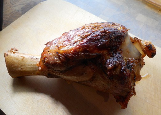 Immer wieder wenden, so dass sie auf allen Seiten gut angebraten ist und mit ein wenig Wasser ablöschen. Mit dem Saft, der sich in der Pfanne bildet, die Stelze fleißig begießen, dadurch wird das Fleisch schön glasiert und erhält perfekte braune Farbe.