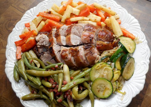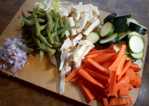 Zutaten Beilagen: diverses Gemüse, zB Karotten, Bohnen (Speck für Speckbohnen), Sellerie, Petersilie, Zucchini, Lauch, Zwiebel, Butter oder Öl, Reis, Kartoffeln