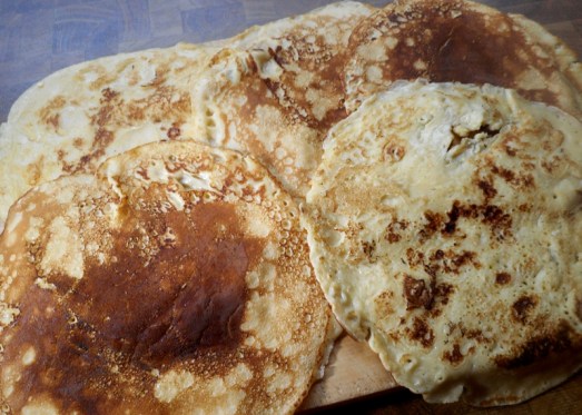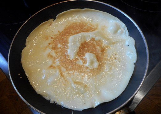 Jetzt werden die Palatschinken vorbereitet: Eier und Milch versprudeln, Mehl und eine kleine Prise Salz dazugeben und weiter versprudeln, bis die gewünschte Konsistenz (dickflüssig) erreicht ist. Die Palatschinken in einer heißen Pfanne mit etwas Butter auf beiden Seiten goldgelb backen.