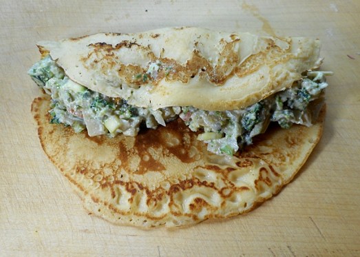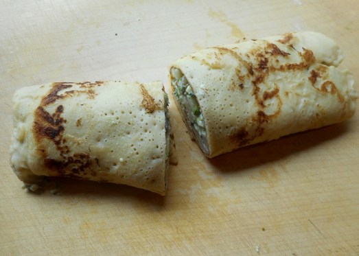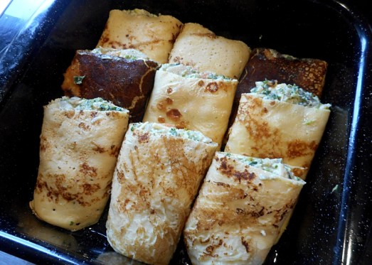 Die Palatschinken mit der Gemüsemasse füllen, halbieren und in eine eingefettete Form schlichten.