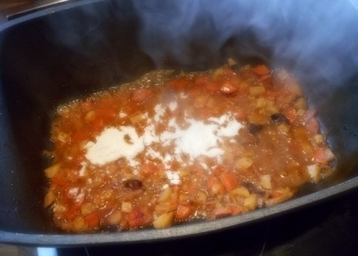 Das Fleisch herausnehmen und warm stellen, Mehl zum Gemüse geben, gut verrühren, mit etwas Suppe aufgießen und kurz kochen lassen.