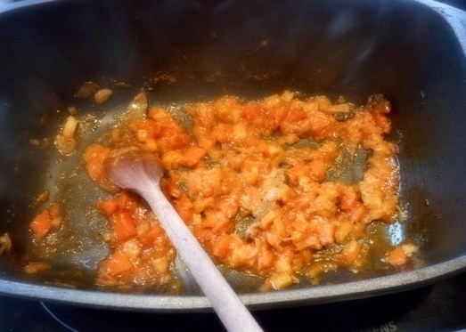 Das klein geschnittene Gemüse, Senf und Tomatenmark dazugeben, durchrösten.