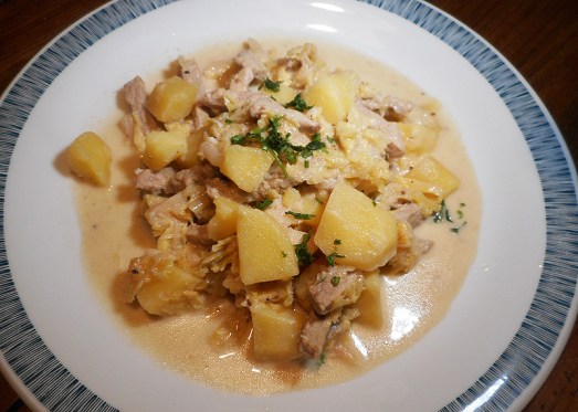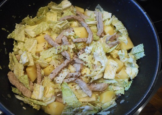 Zutaten: 1/2 kg Kartoffeln (festkochend), 1/2 Kohlkopf, Zwiebel, Knoblauch, Öl, Obers, Kümmel, Salz, Pfeffer, Spritzer Essig, Suppe (Fond oder Würfel), 1/2 kg Fleisch (Lamm, Rind oder Schwein)
