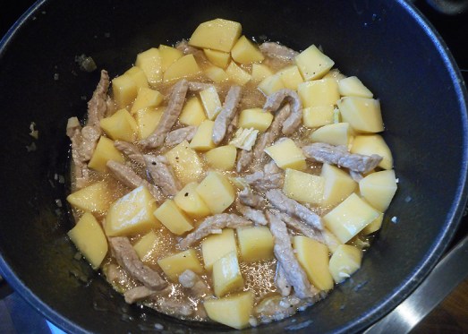 Zwiebel fein schneiden und in ein wenig Öl glasig anschwitzen. Das Fleisch in Stücke schneiden (siehe Bilder) und zu den Zwiebeln geben. Kurz anrösten lassen, dann mit Suppe ablöschen und zugedeckt einige Minuten köcheln lassen.