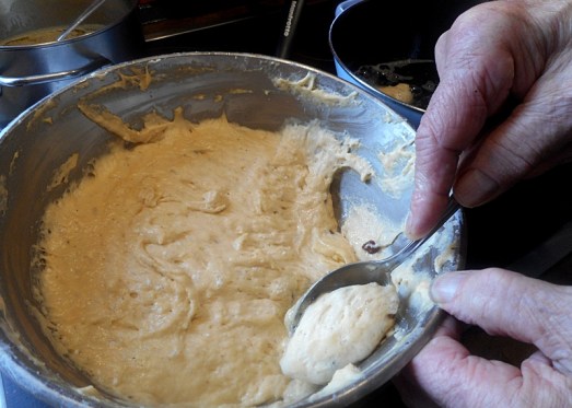 In einer tiefen Pfanne Fett erhitzen. Mit einem Löffel Teig ausstechen …