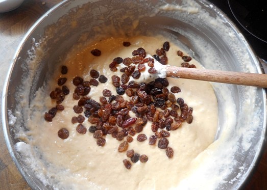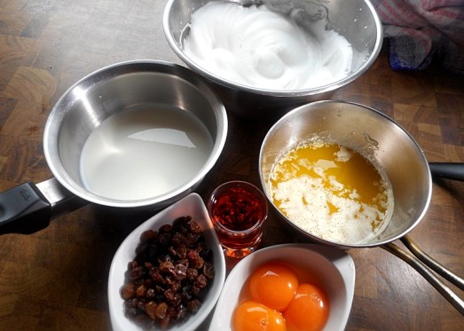Dann mit den drei Dottern, dem Rest der Milch, dem restlichen Zucker, der zerlassenen Butter (lauwarm, nicht heiß!), Vanillezucker, Zitronenschale und Rum zu einem weichen Teig verarbeiten. Aus den Eiweiß Ei-Schnee schlagen und mit den Rosinen behutsam unterheben.
