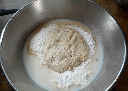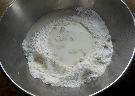Zuerst wird ein sehr weicher Germteig gemacht. Wir beginnen mit dem Dampfl: Das Mehl in eine Schüssel geben, in der Mitte eine Mulde machen und in diese den Germ hineinbröckeln. Rundherum ein wenig Zucker und Salz streuen – auf das Mehl, nicht auf den Germ! Einen Teil der lauwarmen Milch über den Germ gießen, etwas Mehl darüber stauben, zudecken und an einem warmen Ort ca. 10 bis 15 Minuten stehen lassen, bis sich der Germ aufgelöst hat.