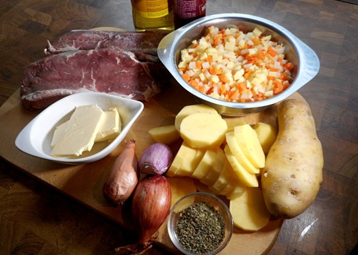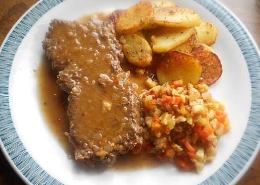 Rostbraten: 2 Stück Rostbraten (à 150 g) Öl, Pfeffer, eine Zwiebel, 50 g Butter, Suppe, Weißwein, Worcestersauce, Senf