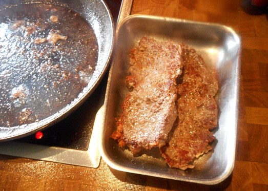 Zutaten: 2 Stück Rostbraten (à 150 g) Öl, Pfeffer, eine Zwiebel, 50 g Butter, Suppe, Weißwein, Worcestersauce, Senf