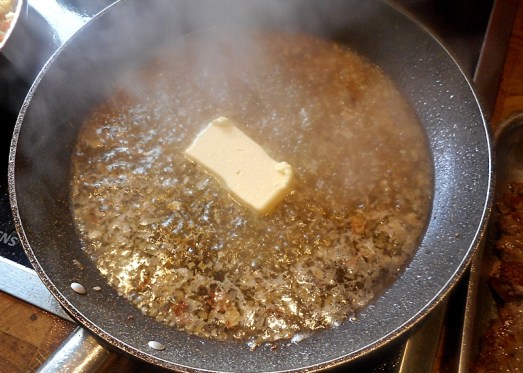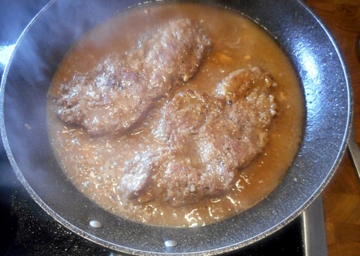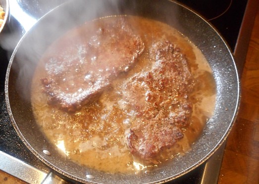 Die Rostbraten in die Sauce legen, mit Senf und Worcestersauce abschmecken. Einige Minuten dünsten lassen.