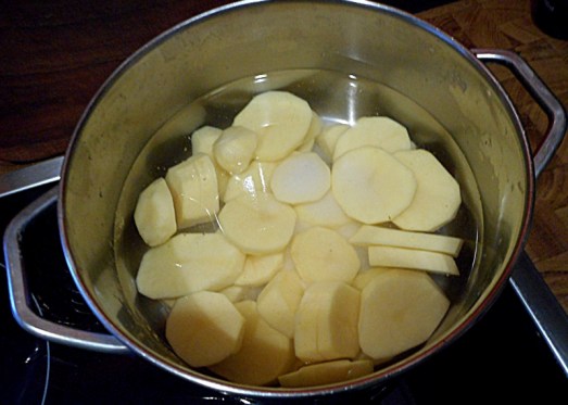 Die Kartoffeln schälen, in dicke Scheiben schneiden und blanchieren.