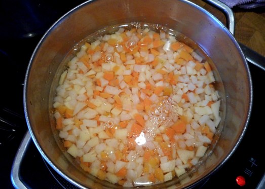 Das Wurzelgemüse kleinschneiden und ebenfalls blanchieren.