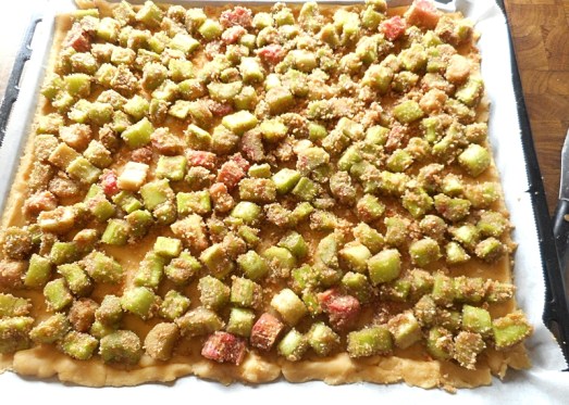 Den Teig ausrollen und auf ein mit Backpapier ausgelegtes Blech legen. Das Rhabarber-Brösel-Zucker-Gemisch auf dem Teig verteilen und zum Schluss die Streusel darüber streuen.