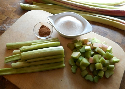 Der Rhabarber wird geschält und würfelig geschnitten.