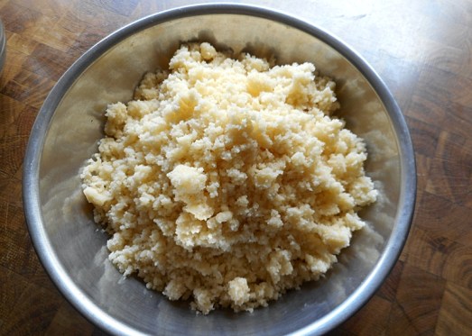 Jetzt werden die Streusel gezaubert. Dafür die Butter (wieder kalt grob gerieben) mit Zucker gut vermischen, dann das Mehl dazugeben. Mit den Fingern rasch verreiben, bis grobe Brösel (Streusel) entstehen. Die Streusel ca. 30 Minuten kalt stellen.