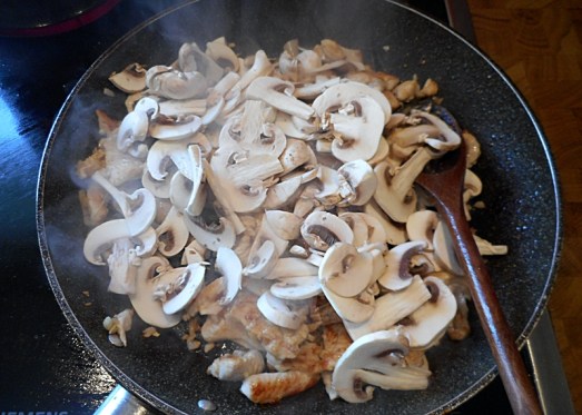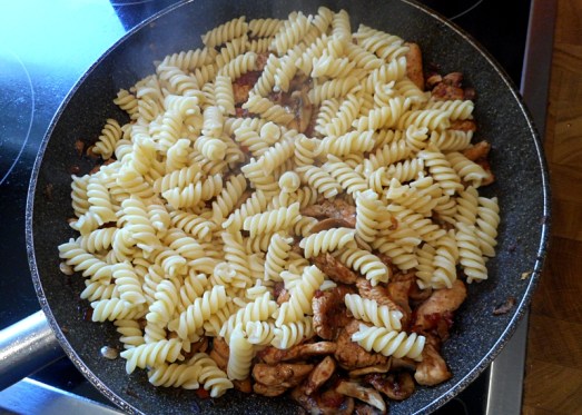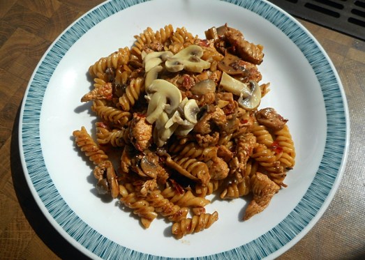 Zutaten: Nudeln, Putenfleisch, Champignons, getrocknete Tomaten, Zwiebel, Öl, Salz, Pfeffer