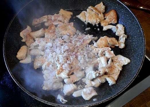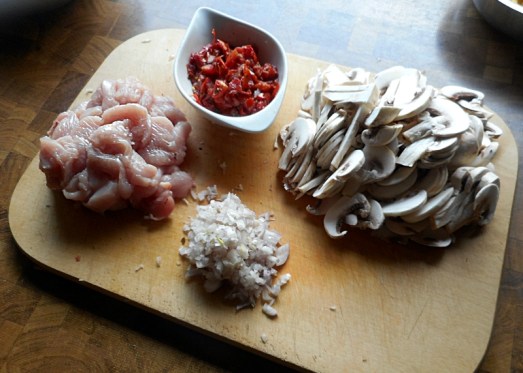 Das Putenfleisch in Streifen schneiden, die Zwiebel und die getrockneten Tomaten kleinwürfelig und die Champignons in dünne Scheiben. Die Nudeln kochen und abtropfen lassen.